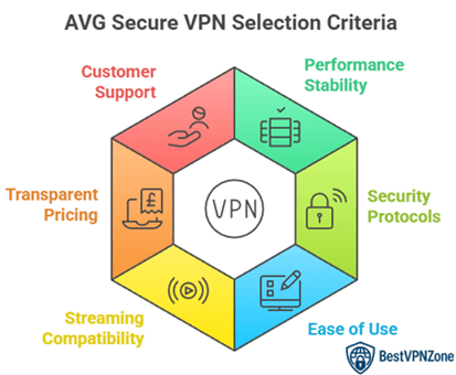 At BestVPNZone, our commitment to credibility ensures that every piece of content is accurate, relevant, and created with objectivity. AVG Secure VPN stands out for its simplicity, reliability, and performance in real-world scenarios. I have spent over 100 hours testing more than 40 security tools to bring an honest, verified view. This review offers a transparent breakdown of features, pros and cons, and pricing. We focus on the following factors while reviewing a tool based on performance, usability, transparency, and value.