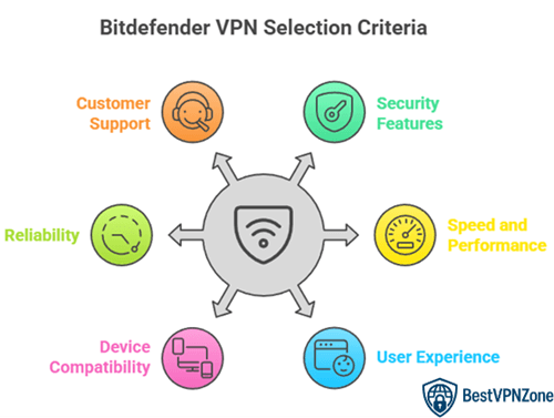 At BestVPNZone, we are committed to delivering accurate, relevant, and trustworthy information backed by extensive testing and expert analysis. Our team spent over 100 hours reviewing VPN services and evaluating more than 40 tools to ensure transparency and credibility. In our Bitdefender VPN review, we focused on essential features, pricing models, and advanced security benefits. Every aspect was tested for performance, privacy, and ease of use to ensure reliable protection for all users. This comprehensive evaluation provides an unbiased view to help you make informed decisions. We focus on the following factors while reviewing a tool based on Bitdefender VPN.